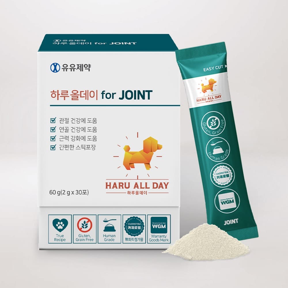하루올데이의 강아지 관절 영양제는 성장기 강아지부터 노령견까지 모두 사용할 수 있는 제품으로, 종합적인 관절 건강 관리를 돕는 데 적합합니다.