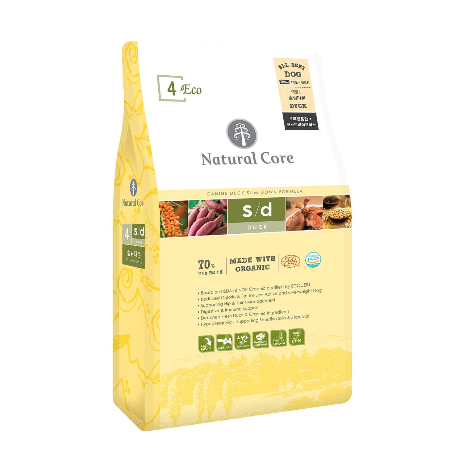 네츄럴코어 슬림다운 사료는 유기농 원재료를 사용하며, 저칼로리 설계로 과체중 강아지를 위한 식단으로 유명합니다.