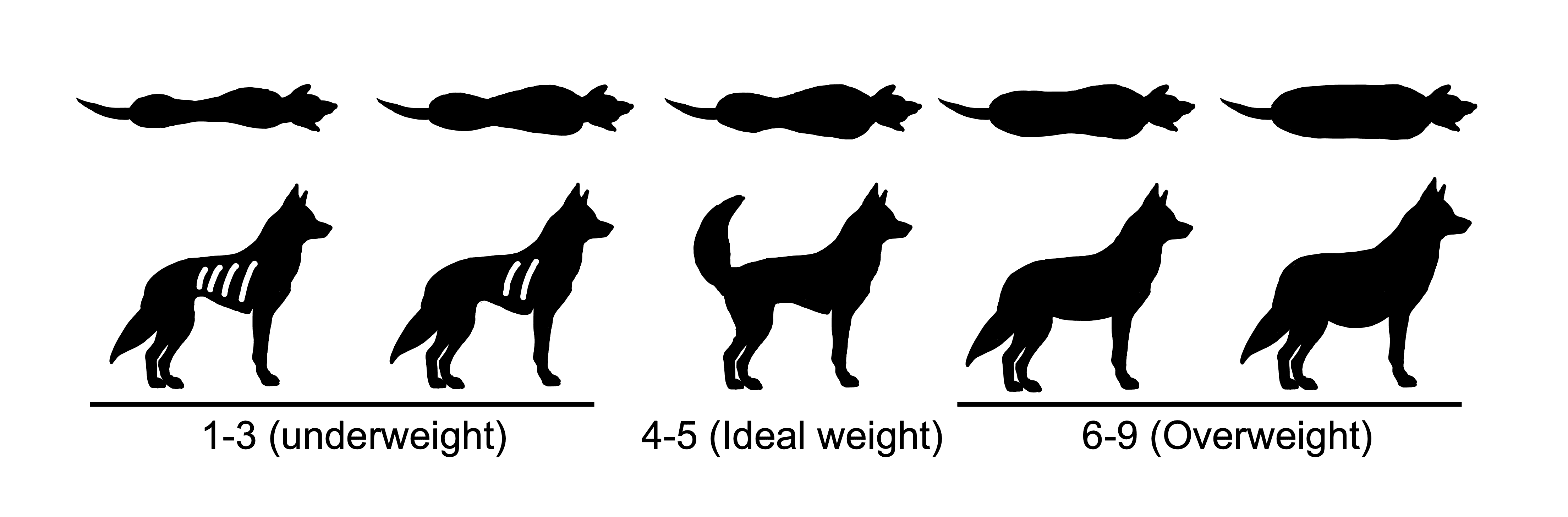 • 1점에서 3점: 지나치게 마른 상태를 의미합니다. 갈비뼈와 척추가 뚜렷이 드러나고, 근육이 부족해 보입니다.